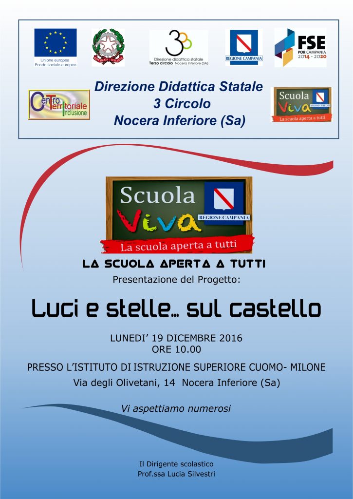 Si registra nel territorio la carenza di luoghi di incontro ed accoglienza e di iniziative socio-culturali che coinvolgano i ragazzi. La scuola ha l’obiettivo di costruire un ambiente di apprendimento che tenga sempre più presente le esigenze di un’utenza che predilige la multimedialità e che impara meglio se posta in situazione di contesto. I laboratori attivati, operando secondo una didattica per competenze, hanno permesso l’acquisizione di competenze disciplinari, trasversali e di cittadinanza che sono state valutate attraverso la realizzazione di un evento finale: un “contest” organizzato all’interno di un musical allestito, a vario titolo, non solo degli alunni e docenti del “3° Circolo” , ma anche di quelli della S.S. 1° g. “Genovesi-Ilaria Alpi”, dell’ I.I.S.“Cuomo-Milone”e dei partner coinvolti nei corrispettivi progetti Scuola viva. Nell’arco del triennio tale evento avrà ad oggetto, come location e tematica di riferimento, un monumento nocerino (Castello del Parco, Caserma Tofano e Monastero Sant’ Anna) di cui si racconteranno storie e leggende da consegnare alla memoria delle famiglie del territorio, affinché acquisiscano maggiore consapevolezza dell’identità sociale e culturale della propria terra, valorizzando così i contenuti e i risultati degli interventi proposti.