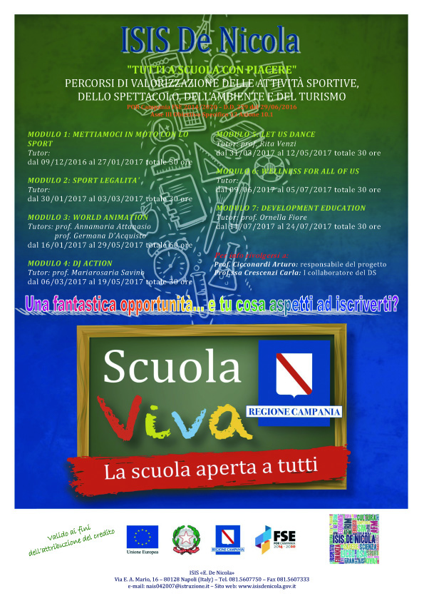 Il seguente progetto si era prefissato come obiettivo di contribuire all’abbattimento della dispersione, organizzando delle attività di laboratorio pomeridiane e coinvolgendo alla partecipazione anche i genitori e le famiglie degli studenti. L’adesione al programma “Scuola Viva” è stata un’opportunità per il riavvicinamento ed il recupero degli allievi che si erano allontanati o risultavano a rischio di allontanamento dal percorso di studi. Tutte le attività miravano alla crescita di ogni singolo partecipante, favorendo la trasmissione di metodi efficaci di apprendimento e puntando alla prevenzione ed al contrasto della dispersione.