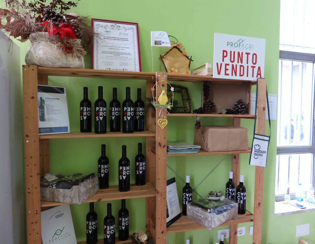 Ebbene si, perché il PROFAGRI non è soltanto una scuola ma anche un’Azienda Agraria, il cui terreno agricolo è pari a circa 18 ettari, dislocati fra Salerno, Battipaglia e Capaccio. A Capaccio, località Gromola, è presente la vigna da cui, grazie a Scuola Viva si ottengono vini Capoclasse e Penna Rossa, un Fiano ed un Aglianico che vengono venduti al pubblico negli store presenti in due sedi scolastiche.