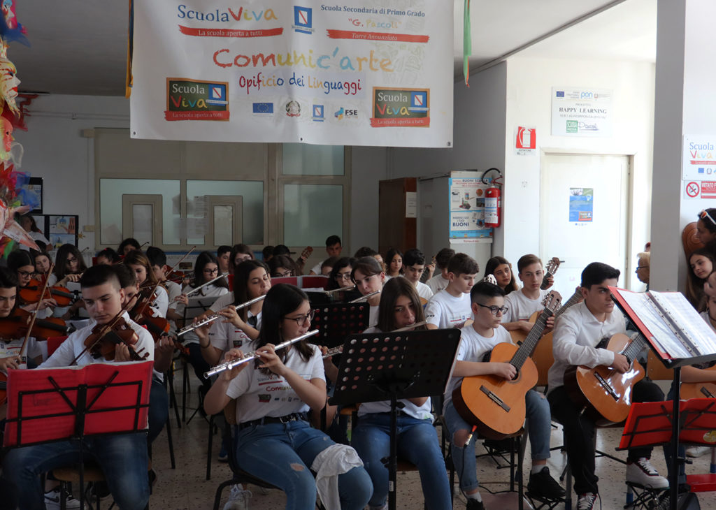 A Torre Annunziata c’è una scuola dove l’Arte si comunica in tutte le sue forme e modalità, grazie ai laboratori ed alle attività pomeridiane portate avanti con Scuola Viva! Alla Scuola Secondaria di I grado Giovanni Pascoli, infatti, gli spazi scolastici diventano L’Opificio dei Linguaggi riuscendo, in maniera innovativa, a rappresentare attraverso parole, musica, immagini, colori, gesti ed espressioni, il complesso mondo della comunicazione e la sua arte.