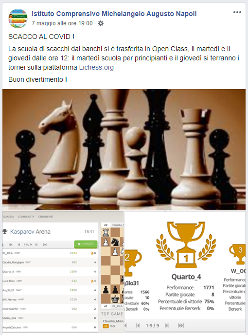 “SCACCO AL COVID”: si chiama così l’iniziativa dei dirigenti e degli insegnanti dell’Istituto Comprensivo “Michelangelo Augusto” di Napoli che nonostante la sospensione delle attività didattiche dovuta all’emergenza sanitaria da Coronavirus non hanno voluto interrompere per i ragazzi anche le attività extracurricolari e così hanno pensato di utilizzare il web per permettere agli allievi e alle allieve di continuare a seguire online i vari corsi pomeridiani. Tra questi, in primis, il corso di scacchi frequentatissimo dai ragazzi che per non smettere di competere e esercitarsi hanno “trasferito” online il campo di battaglia. “La scuola di scacchi – si annuncia infatti sulla pagina Facebook dell’Istituto – dai banchi si è trasferita in “Open Class”, il martedì e il giovedì dalle ore 12. Il martedì scuola per principianti e il giovedì si terranno i tornei sulla piattaforma Lichess.org”.