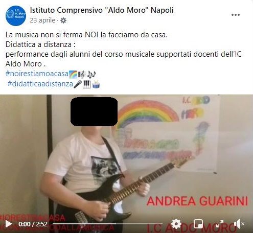 Si apre con il celebre assolo di chitarra elettrica di Brian May in “Bohemian Rhapsody” dei Queen la performance musicale “a distanza” realizzata, durante i giorni della quarantena e dell’isolamento sociale a casa, dagli studenti e dalle studentesse della scuola media “Istituto Comprensivo Aldo Moro di Napoli”. “Contagiati dalla musica”: questo il titolo scelto per la performance collettiva che comincia dunque con una schitarrata epica magistralmente interpretata, non senza un certo orgoglio e una certa qual soddisfazione, da un ispiratissimo Andrea.