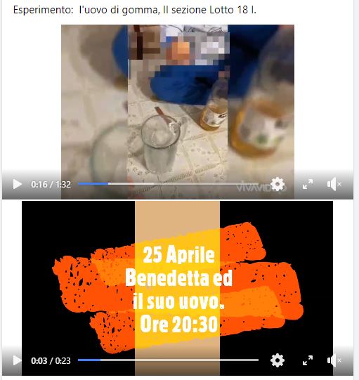 Vista l’impossibilità di frequentare materialmente il laboratorio i ragazzi hanno comunque voluto continuare gli esperimenti di chimica. Tra questi, quello del cosiddetto “uovo di gomma”. A documentare il tutto dei veri e propri video tutorial realizzati dai bambini con l’aiuto di parenti e genitori. Dopo qualche tentativo andato a vuoto e svariate uova spiaccicate a terra i ragazzi sono riusciti dunque a dimostrare che se si immerge per 24 ore un uovo nell’aceto questo diventa “di gomma” perché l’aceto reagisce con il carbonato di calcio del guscio portando alla formazione di un’effervescenza e alla sua disgregazione. Facile no?