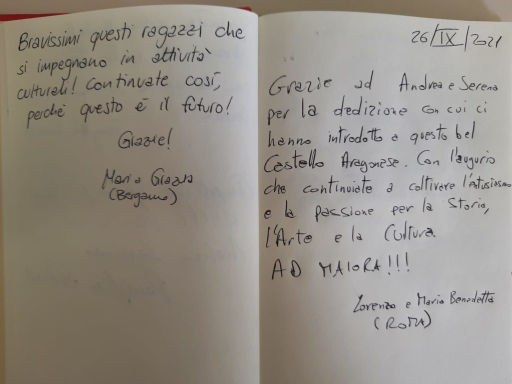 La riprova della dedizione delle giovani guide, che mostrano con minuzia e trasporto il Patrimonio del Museo dei Campi Flegrei immerso in un panorama mozzafiato, sono i riconoscimenti e le numerose dediche che vengono lasciate, ogni sabato e domenica, dai tanti visitatori soddisfatti.