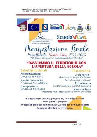 Al LS Cristoforo Colombo di Marigliano, concluso il Progetto Scuola Viva Ravviviamo il territorio con l’apertura della scuola. La manifestazione conclusiva ha visto la partecipazione dell’Assessore alla Scuola, alle Politiche Sociali e Giovanili della Regione Campania, Lucia Fortini.