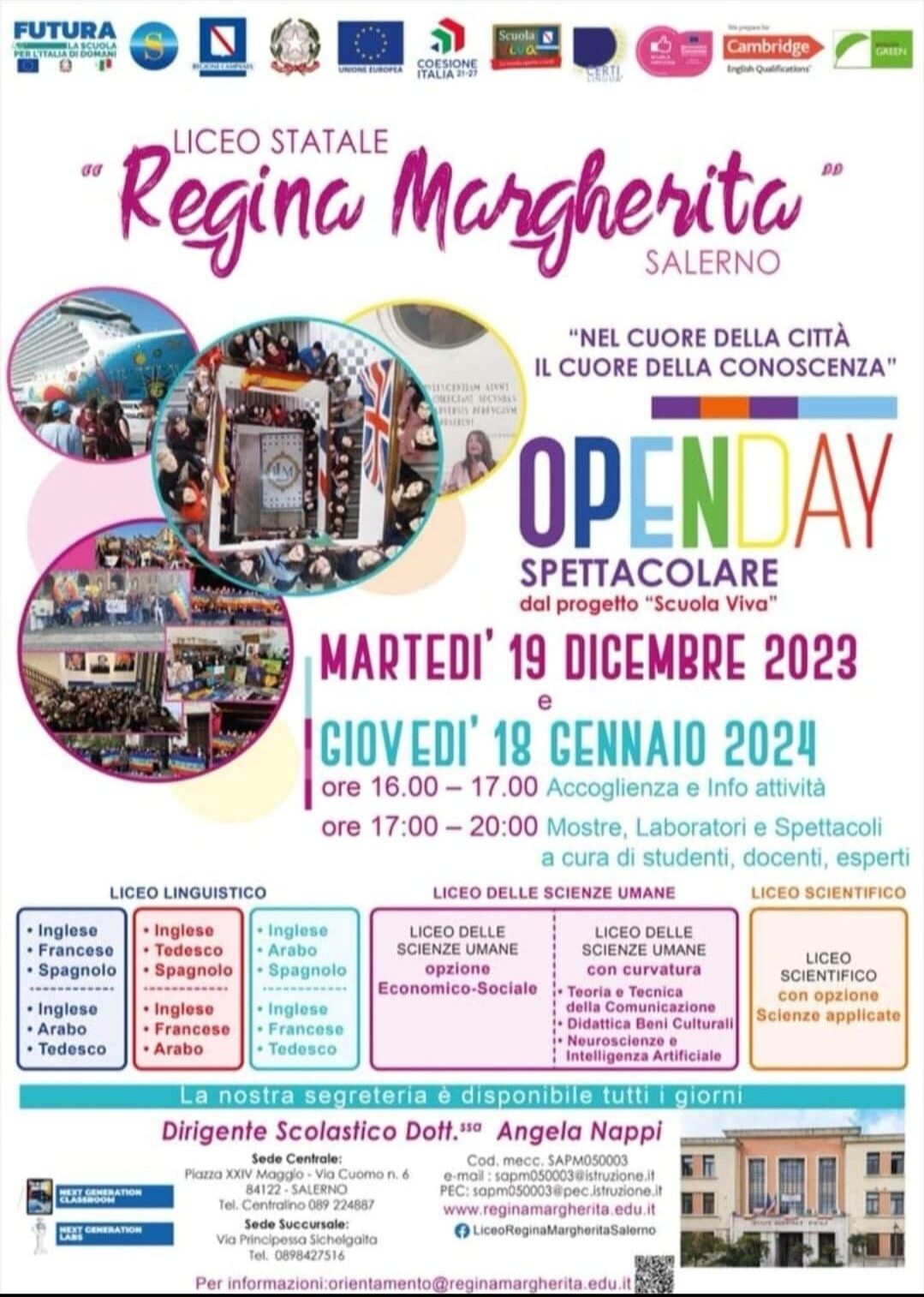L’offerta formativa del LS Regina Margherita presenta, quest’anno, due Nuove Curvature dell’Indirizzo di Scienze Umane – come riporta Salerno Today : Pedagogia e Didattica dei Beni Culturali e Neuroscienze e Intelligenza Artificiale.