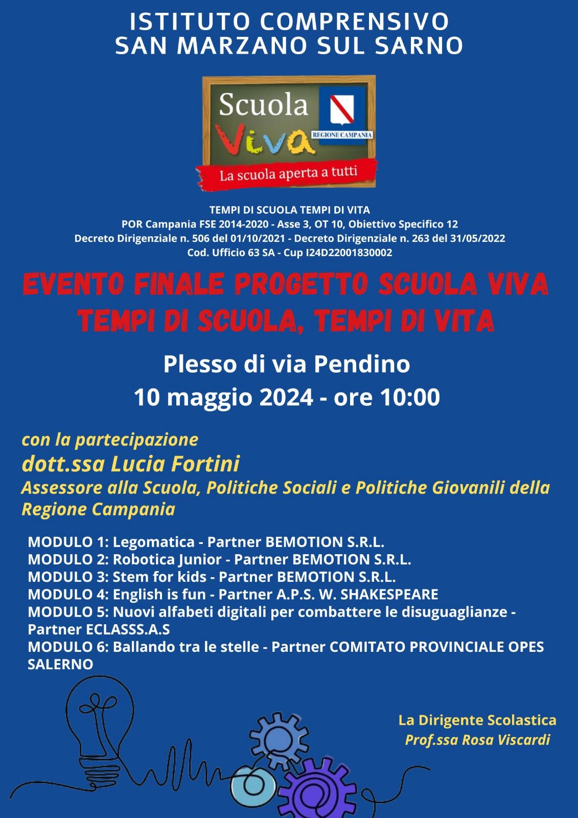 La manifestazione finale si è tenuta venerdì 10 maggio 2024. Ed ha visto la partecipazione anche dell’Assessore alla Scuola, alle Politiche Sociali e Giovanili della Regione Campania, Lucia Fortini.