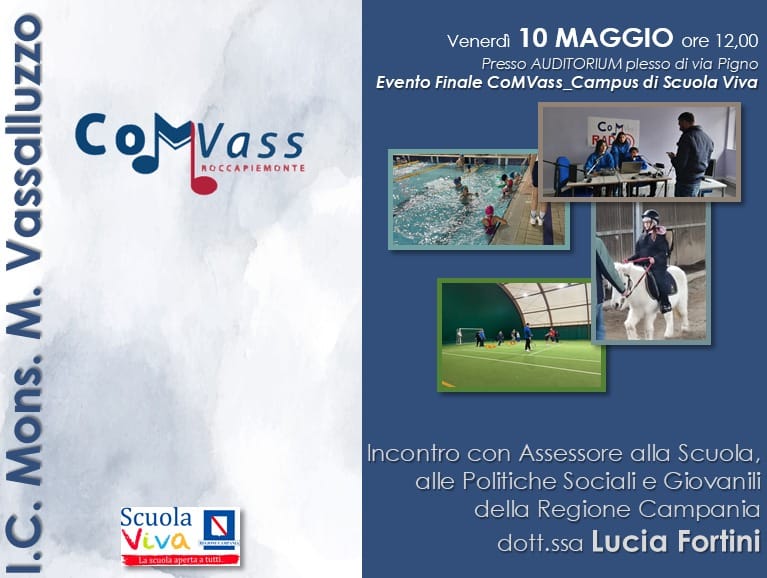 All’IC Monsignor Vassalluzzo di Roccapiemonte si è tenuta la manifestazione finale del Progetto Scuola Viva “CoMVass_Campus”. Presente anche l’Assessore alla Scuola, alle Politiche Sociali e Giovanili della Regione Campania, Lucia Fortini.