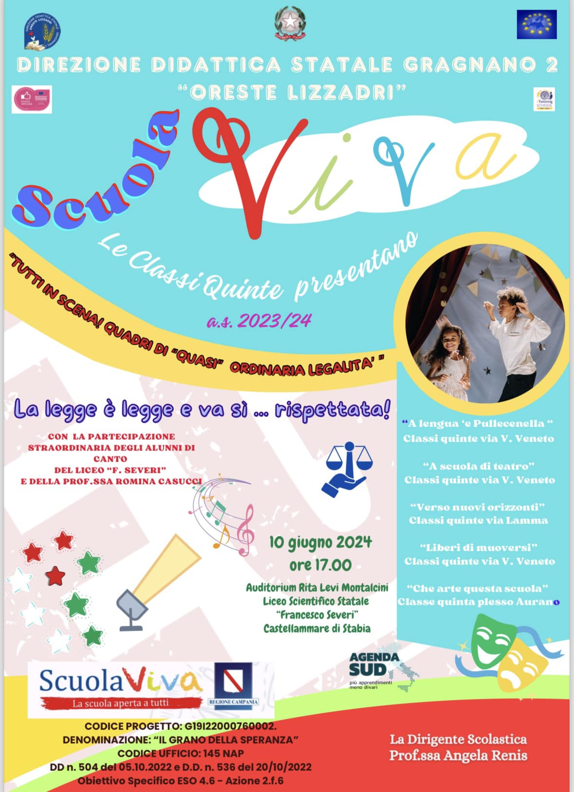 La manifestazione finale si è tenuta lunedì 10 giugno, presso l’Auditorium del Liceo Scientifico Statale “F. Severi” di Castellammare di Stabia. Alla presenza dell’Assessore Lucia Fortini, è stato messo in scena lo spettacolo “Tutti in scena! Quadri di… quasi ordinaria legalità. La legge è legge e va sì… rispettata!”.