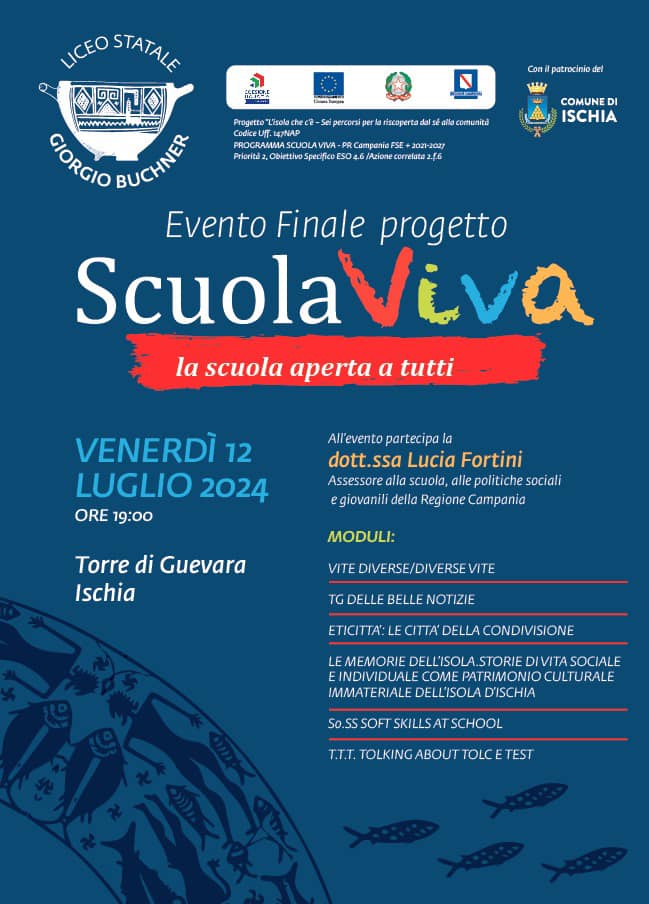 Al LS Buchner di Ischia, si è tenuta la manifestazione finale del Progetto Scuola Viva dal titolo “L’isola che c’è”. All’evento, anche l’Assessore alla Scuola, alle Politiche Sociali e Giovanili della Regione Campania, Lucia Fortini.