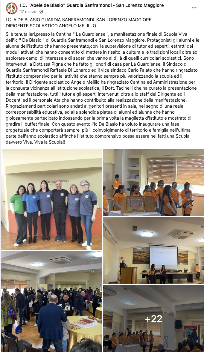 La manifestazione finale si è tenuta il 16 marzo 2024 presso la Sala delle Conferenze – Cantina Sociale “La Guardiense”. Protagonisti gli alunni e le alunne dell’Istituto che hanno presentato, con la supervisione di tutor ed esperti, estratti dei moduli attivati che hanno consentito di mettere in risalto la cultura e le tradizioni locali oltre ad esplorare campi di interesse e di saperi che vanno al di là di quelli curricolari scolastici.