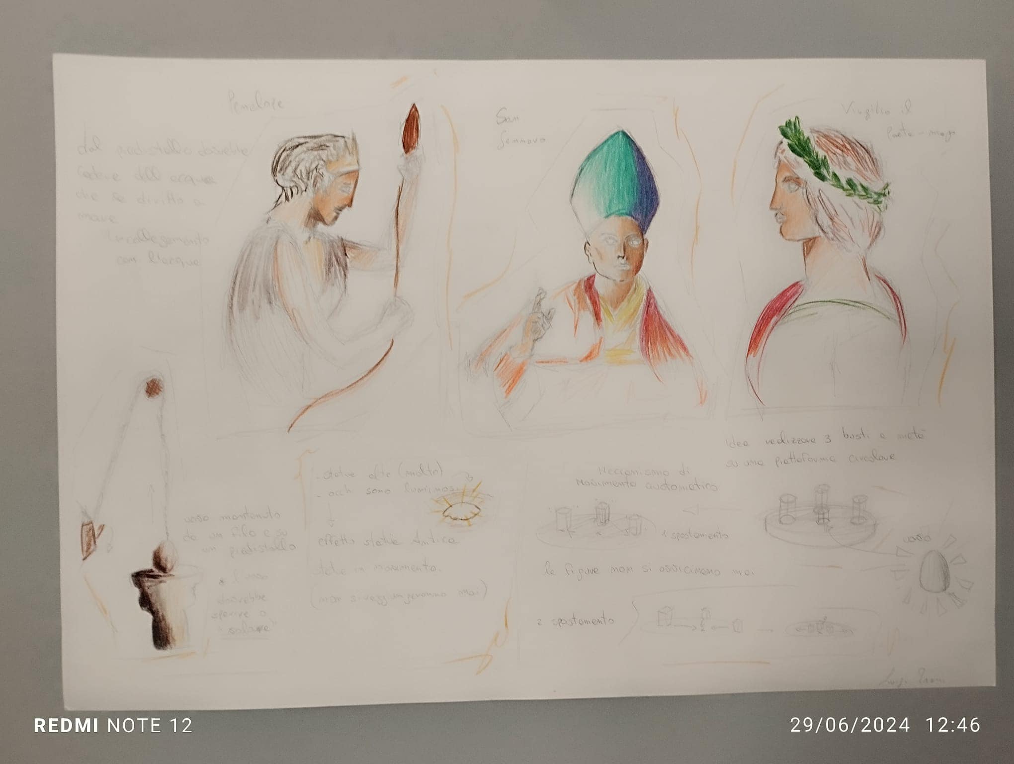 Il bozzetto rappresenta tre figure (San Gennaro, Partenope, San Virgilio) che riprendono la cultura napoletana e Ischitana. Al centro, l’uovo di Virgilio. Le figure danzano come un carillon e sono destinate, quindi, a non raggiungersi mai.