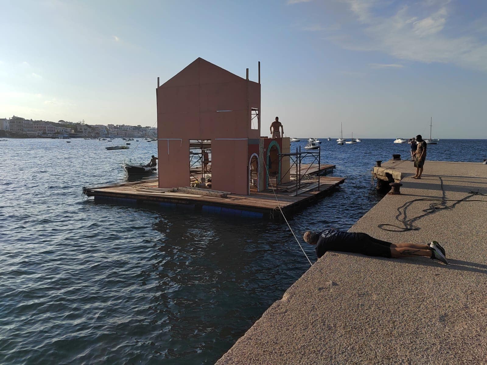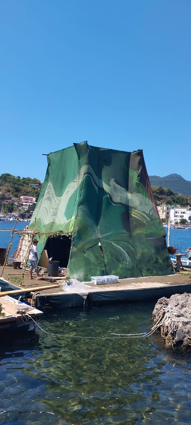 La zattera rappresenta la storia della formazione di Ischia. Parte con la raffigurazione di un vulcano fumante che poi, aprendosi, si trasforma nell’isola d’Ischia, con tutti i suoi elementi caratterizzanti.