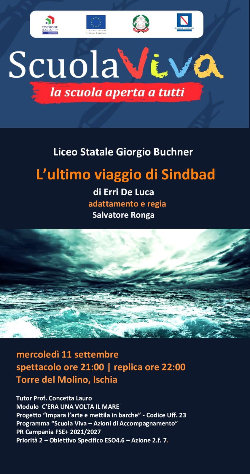 Il modulo “C’era una volta il mare”, relativo alla fase 2 del progetto, è stato completato – relativamente ai primi 12 mesi, l’11 settembre 2024. In questo giorno, infatti, si è tenuto l’evento spettacolo “L’ultimo viaggio di Sindbad”, adattamento e regia di Salvatore Ronga, dall’omonimo libro di Erri de Luca.