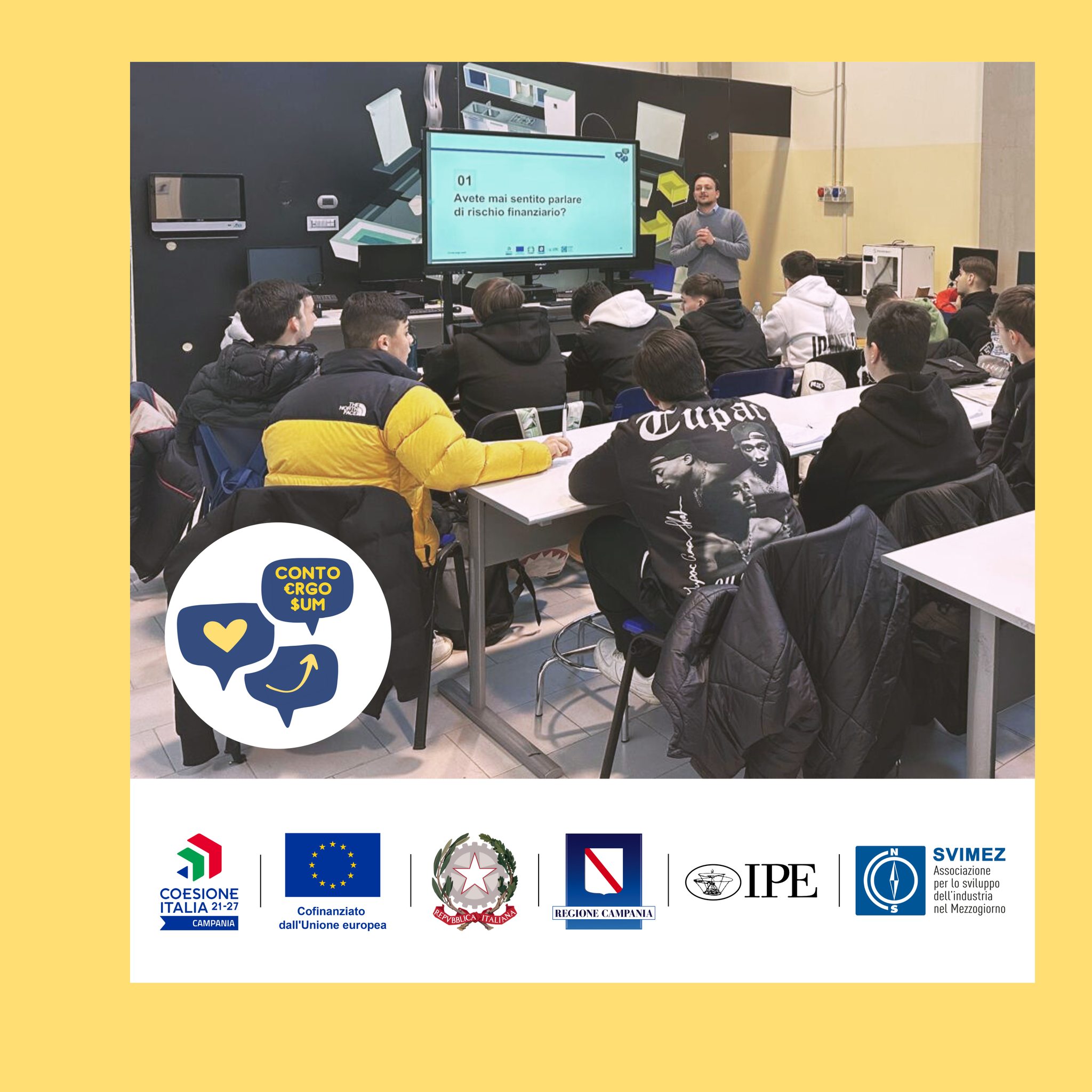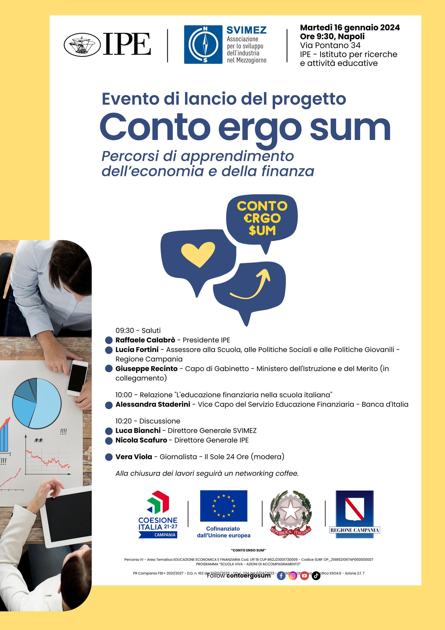Il progetto “Conto ergo sum”: Educazione Finanziaria per il Futuro è nato dalla collaborazione tra IPE – Istituto per Ricerche ed attività Educative e SVIMEZ (Associazione per lo sviluppo dell’industria nel Mezzogiorno). E rientra nell’ambito del Programma “Scuola Viva – Azioni di Accompagnamento”. Esso è rivolto a ragazze e ragazzi delle scuole del secondo ciclo di istruzione.