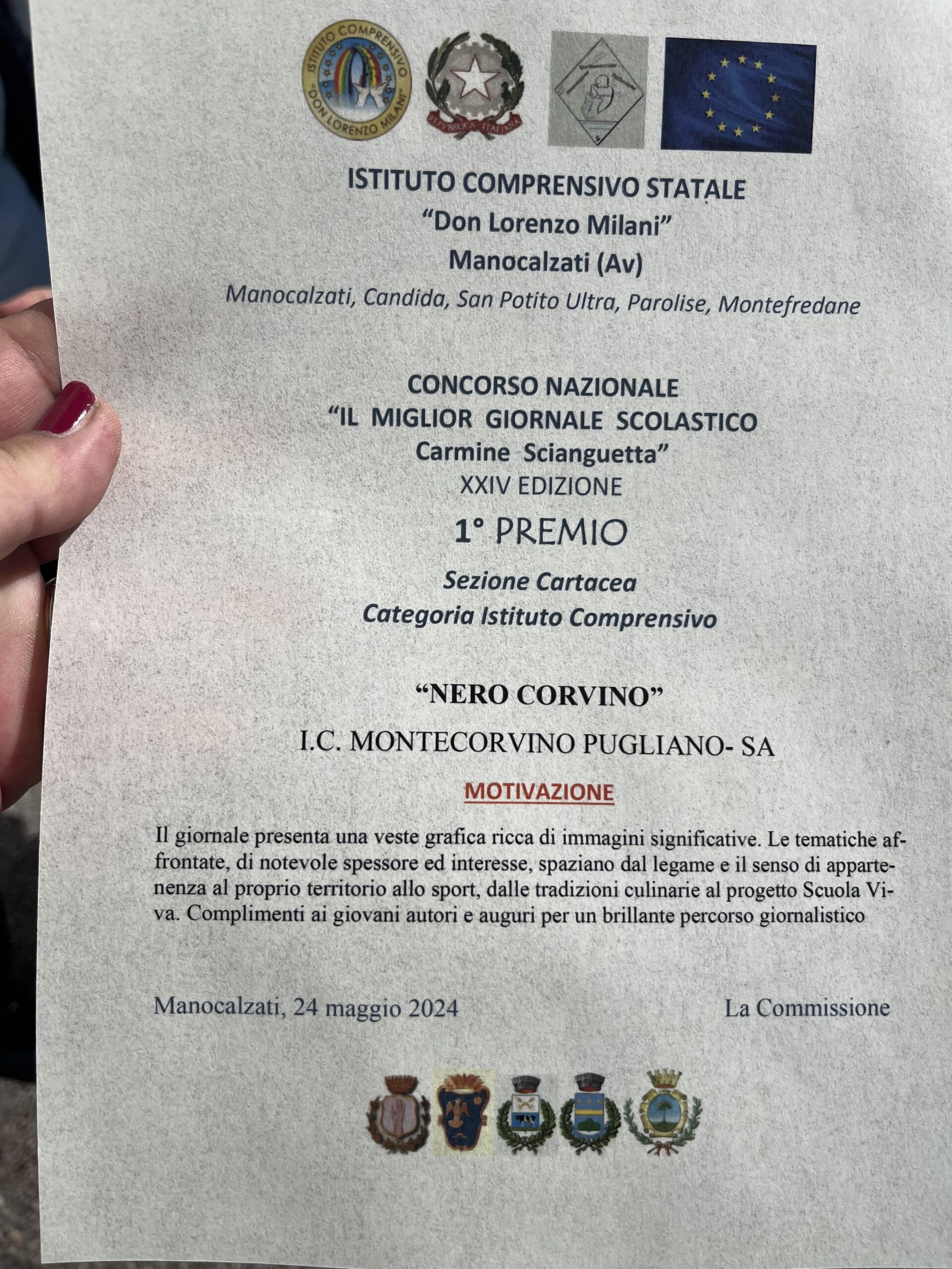 Con il giornalino realizzato, le ragazze ed i ragazzi dell’IC Pugliano Montecorvino hanno partecipato alla XXIV edizione del concorso nazionale “Il miglior giornale scolastico”. Per la sezione Cartacea, Categoria Istituto Comprensivo, Nero Corvino si è classificato al 1° posto, ricevendo l’attestato che condividiamo qui di seguito. La Commissione, presso l’IC Don Milani di Manocalzati (AV), ha così motivato il riconoscimento: “Il giornale presenta una veste grafica ricca di immagini significative. Le tematiche affrontate, di notevole spessore ed interesse, spaziano dal legame e il senso di appartenenza al proprio territorio allo sport, dalle tradizioni culinarie al progetto Scuola Viva. Complimenti ai giovani autori e auguri per un brillante percorso giornalistico”.