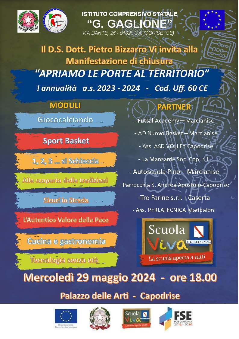 All’IC Giacomo Gaglione di Capodrise concluso il progetto Scuola Viva dal titolo “APRIAMO LE PORTE AL TERRITORIO 5”.