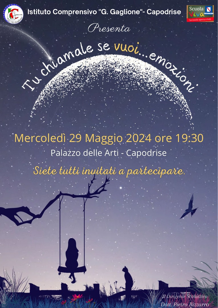 La manifestazione finale si è tenuta il 29 maggio 2024, presso il Palazzo delle Arti di Capodrise, con una giornata di disseminazione dei risultati e la messa in scena dello spettacolo “Tu chiamale se vuoi…emozioni“. L’evento ha visto il coinvolgimento, oltre che della comunità locale, delle famiglie che hanno accompagnato i partecipanti in tutte le fasi del progetto.