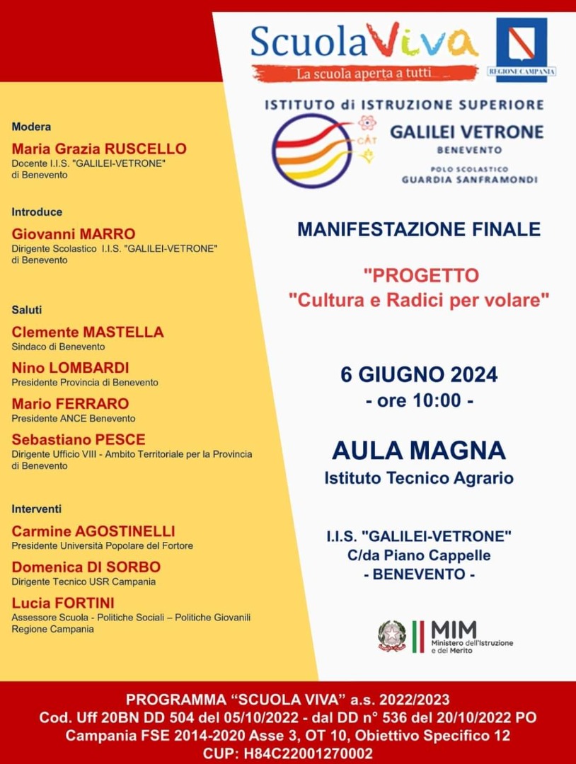 Si è tenuta il 6 giugno 2024, presso la sede dell’istituto tecnico agrario IS Galilei Vetrone di Benevento, la manifestazione finale del progetto Scuola Viva “Culture e radici per volare”.