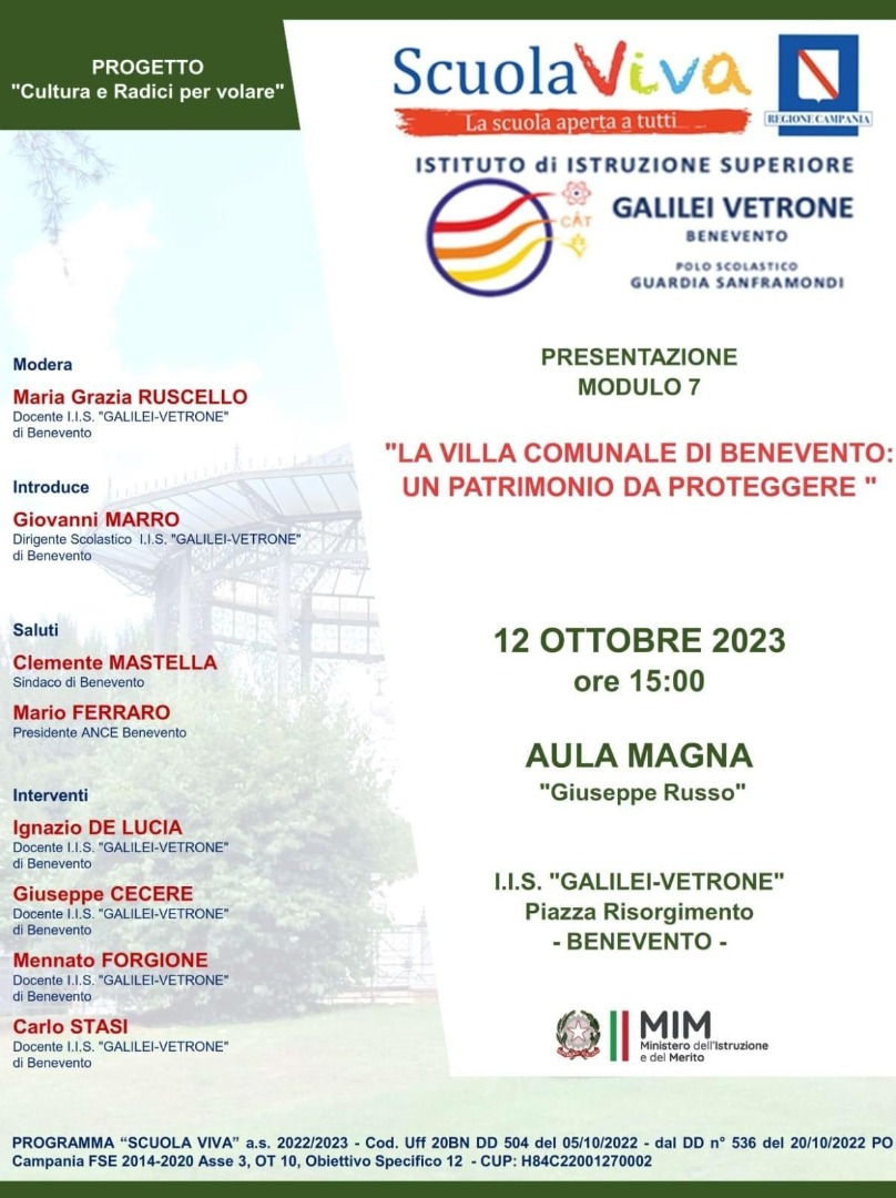 Il 12 ottobre 2023, infatti, i ragazzi che hanno partecipato al modulo, hanno presentato il progetto sulla villa comunale di Benevento che ha approfondito alcuni aspetti storici ed architettonici presenti all’interno del complesso. Allo stesso tempo, i ragazzi hanno formulato proposte e idee sia sugli aspetti ambientali e territoriali sia su quelli più specifici legati all’agraria e al verde ornamentale.