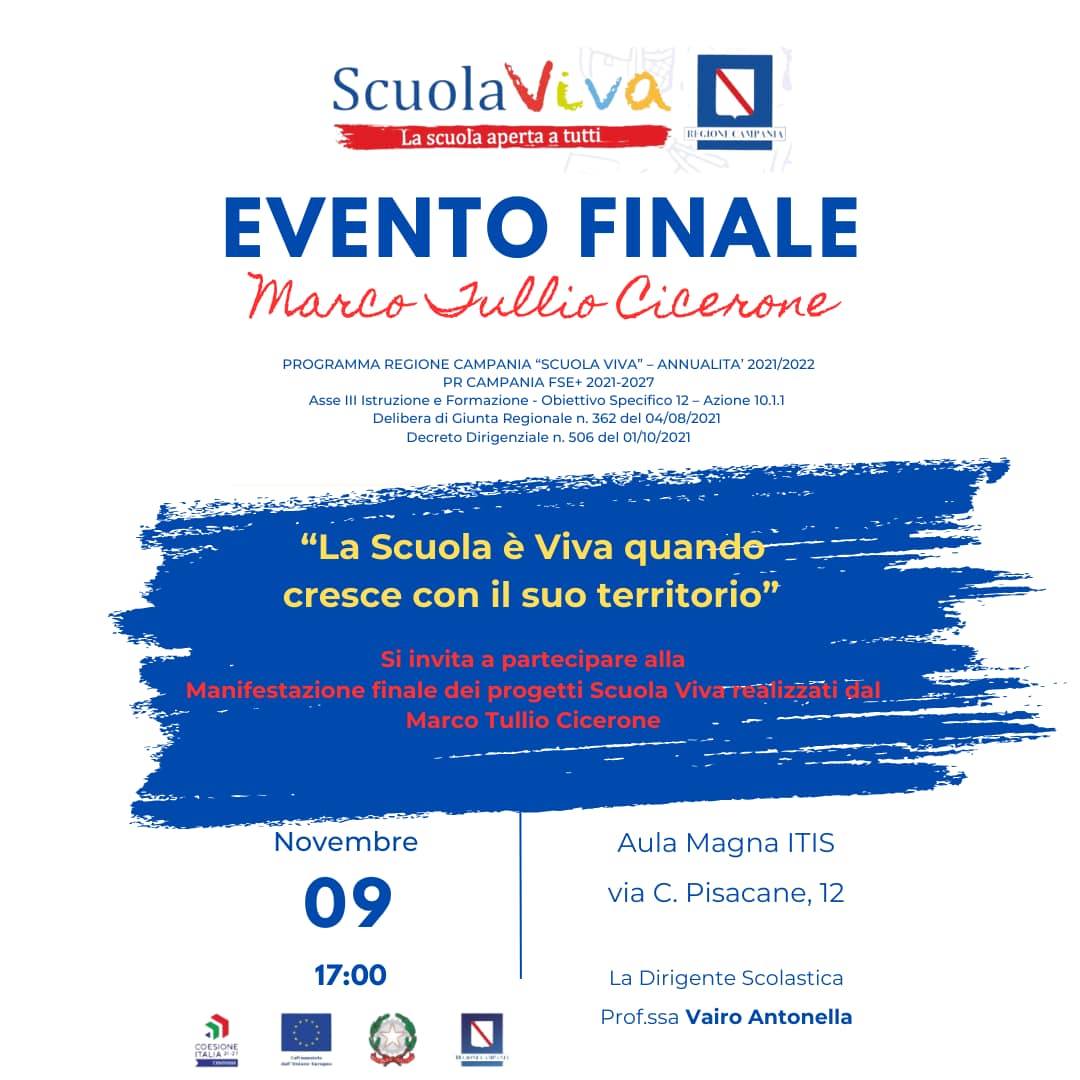 All’IISS Marco Tullio Cicerone, concluso il progetto LA SCUOLA È VIVA, della I annualità del Programma Scuola Viva 2021-2027 della Regione Campania. Il 9 novembre 2024 presso la sede dell’Istituto, si è tenuta la manifestazione finale.