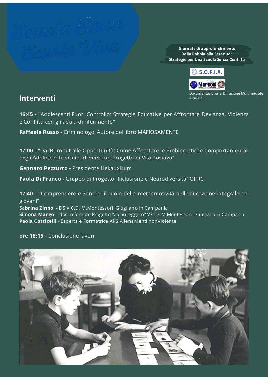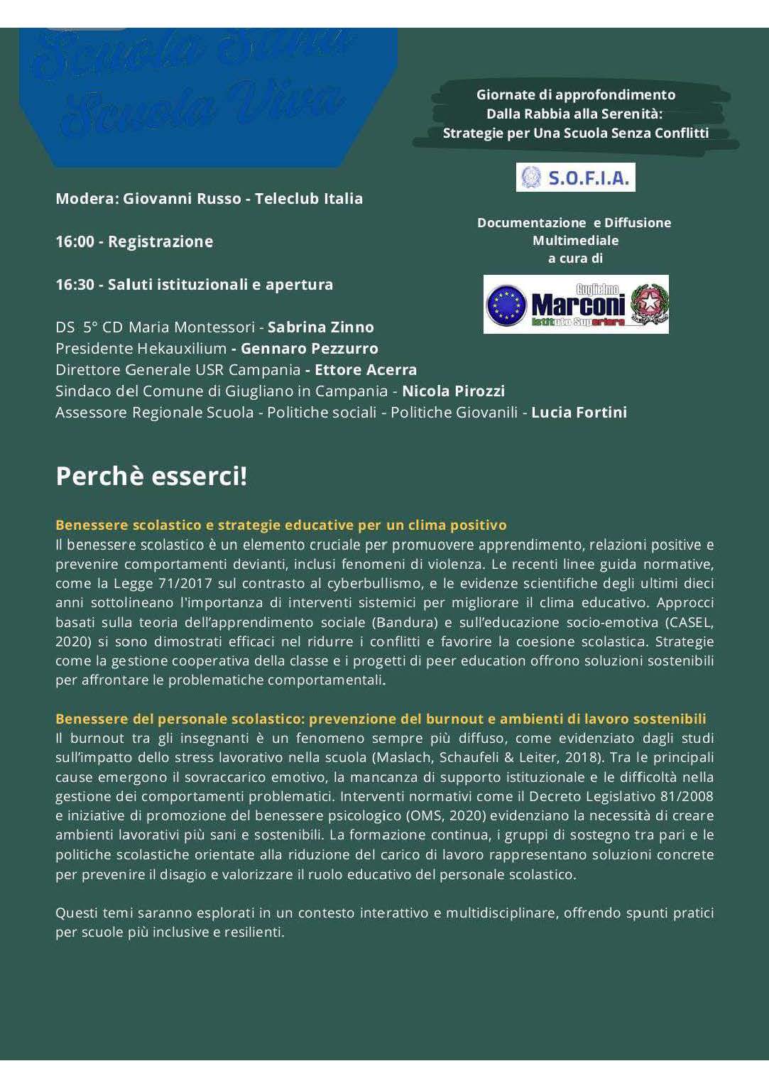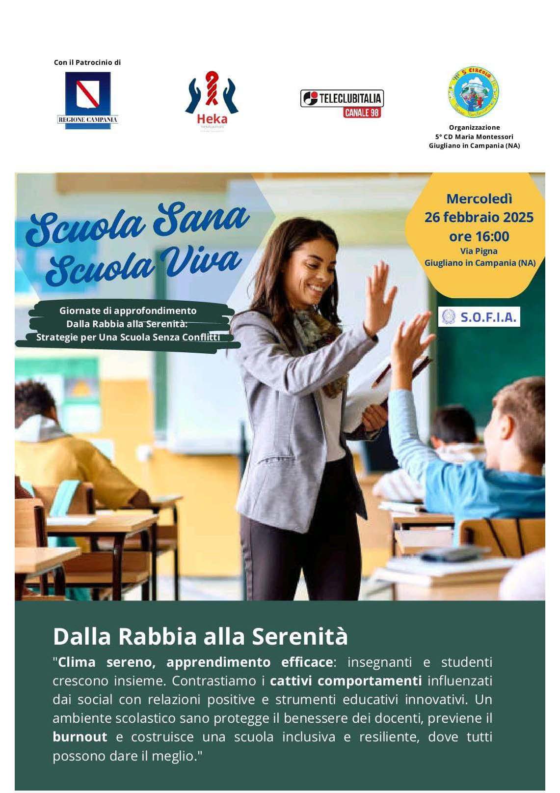 Da queste evidenze, muove la necessità dell’approfondimento “Scuola Sana, Scuola Viva” della DD 5° Circolo Montessori di Giugliano. La formazione continua, i gruppi di sostegno tra pari e le politiche scolastiche orientate alla riduzione del carico di lavoro possono offrire soluzioni concrete per prevenire il disagio e valorizzare il ruolo educativo del personale scolastico. L’approfondimento è stato reso disponibile anche attraverso la piattaforma S.O.F.I.A.: il Sistema Operativo per la Formazione e le Iniziative di Aggiornamento del personale della scuola