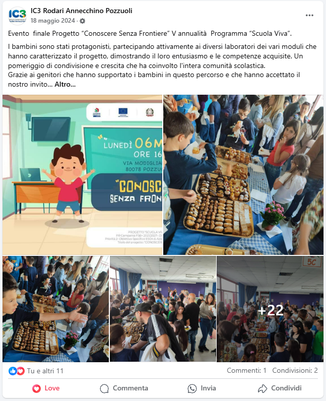 La manifestazione finale si è tenuta il 6 maggio scorso relativamente alla conclusione delle attività previste dai moduli. “I bambini sono stati protagonisti, partecipando attivamente ai diversi laboratori dei vari moduli che hanno caratterizzato il progetto, dimostrando il loro entusiasmo e le competenze acquisite. Un pomeriggio di condivisione e crescita che ha coinvolto l’intera comunità scolastica. Grazie ai genitori che hanno supportato i bambini in questo percorso e che hanno accettato il nostro invito”, il messaggio diffuso dai referenti del progetto, attraverso le pagine social della scuola.