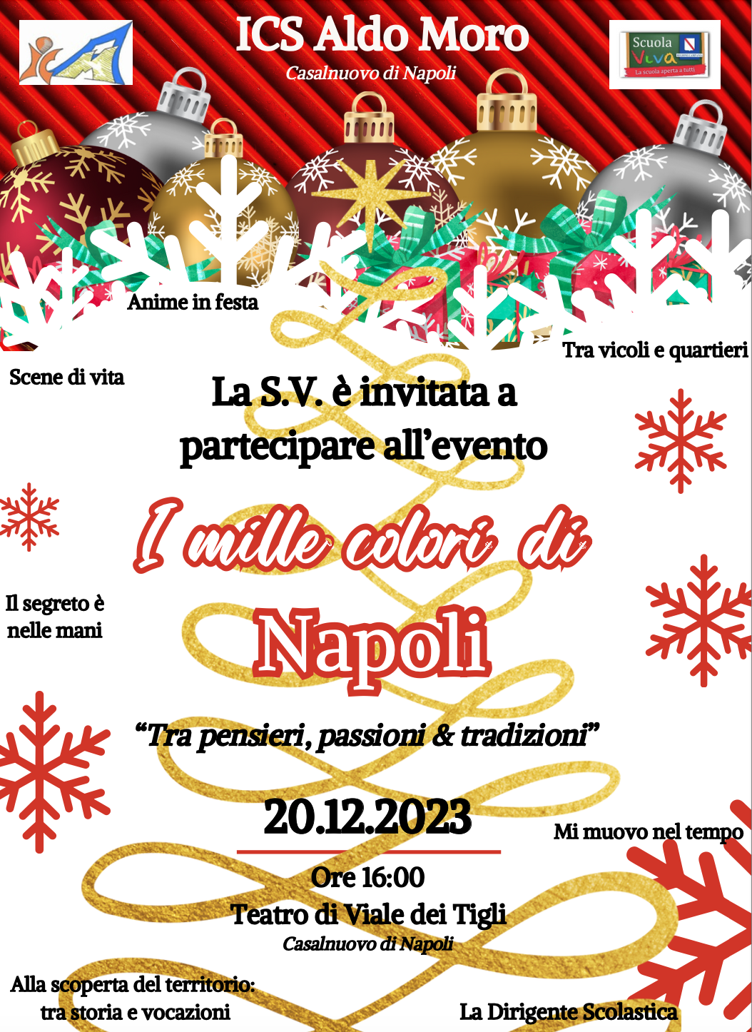 L’evento, aperto al pubblico, si è tenuto il 20 dicembre 2023. Ed ha riscosso un grande successo ed un grande entusiasmo di tutta la comunità scolastica. Ed ha coinvolto, oltre alle famiglie e ai genitori dei ragazzi, anche la comunità locale. Lo spettacolo si è tenuto presso il Teatro di Viale dei Tigli di Casalnuovo di Napoli.