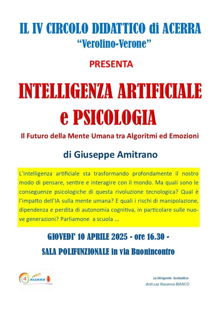La DD IV Circolo di Acerra promuove un importante momento di riflessione e confronto con l’evento dal titolo “Intelligenza Artificiale e Psicologia – Il Futuro della Mente Umana tra Algoritmi ed Emozioni”, a cura di Giuseppe Amitrano. L’incontro si terrà giovedì 10 aprile 2025 alle ore 16.30, presso la Sala Polifunzionale di via Buonincontro, e si rivolge a docenti, genitori, studenti e a tutta la comunità scolastica e cittadina interessata.