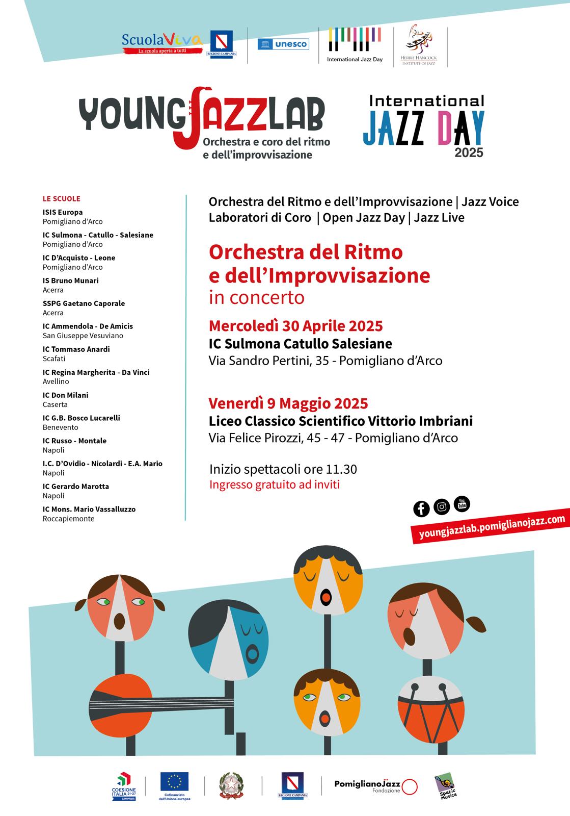 In occasione dell’International Jazz Day 2025, il Coro dell’Orchestra del Ritmo e dell’Improvvisazione si è esibita in due concerti gratuiti: il 30 aprile, presso l’IC 4 Sulmona Catullo Salesiane di Pomigliano d’Arco, mentre il secondo appuntamento si è tenuto venerdì 9 maggio al LS Vittorio Imbriani.