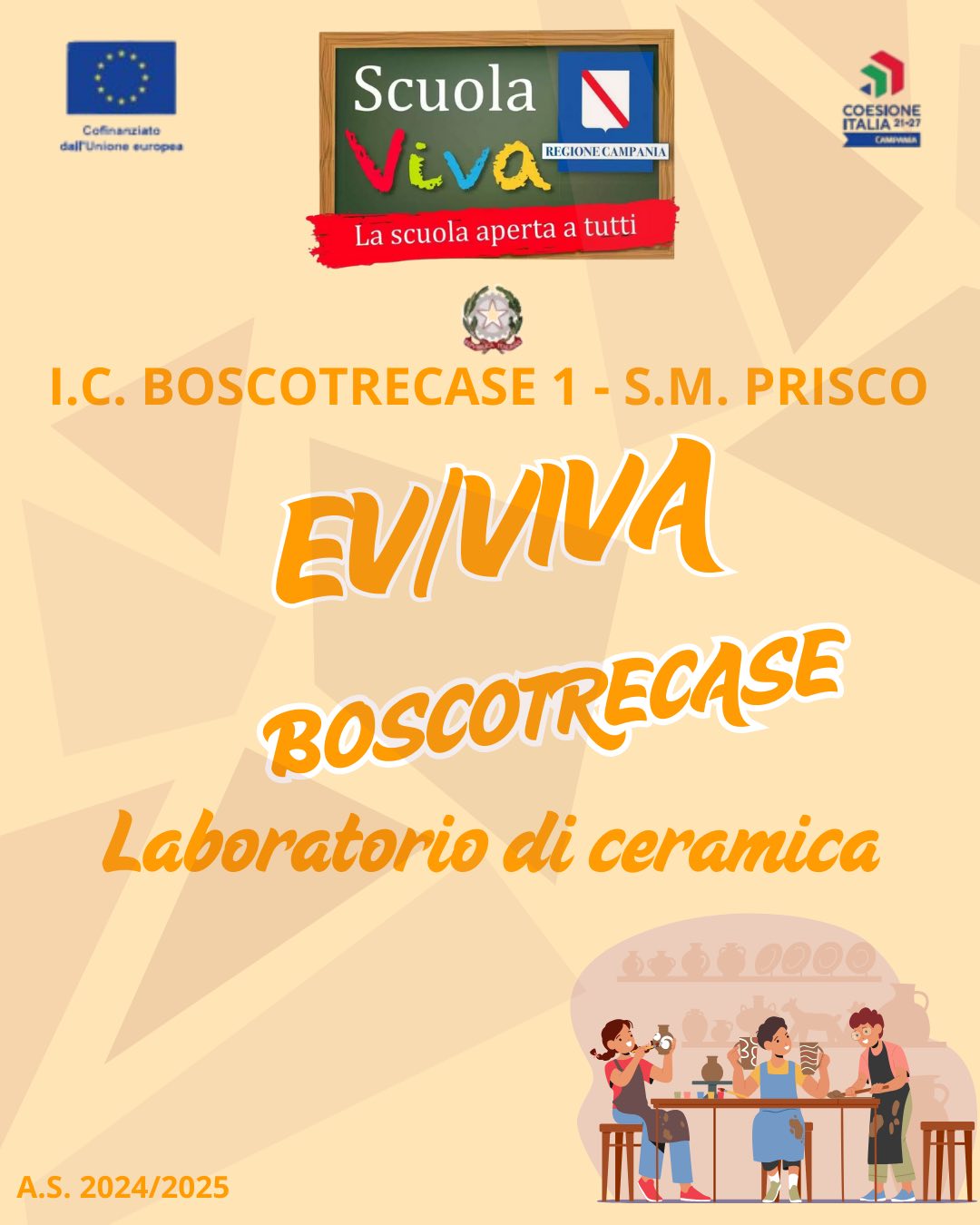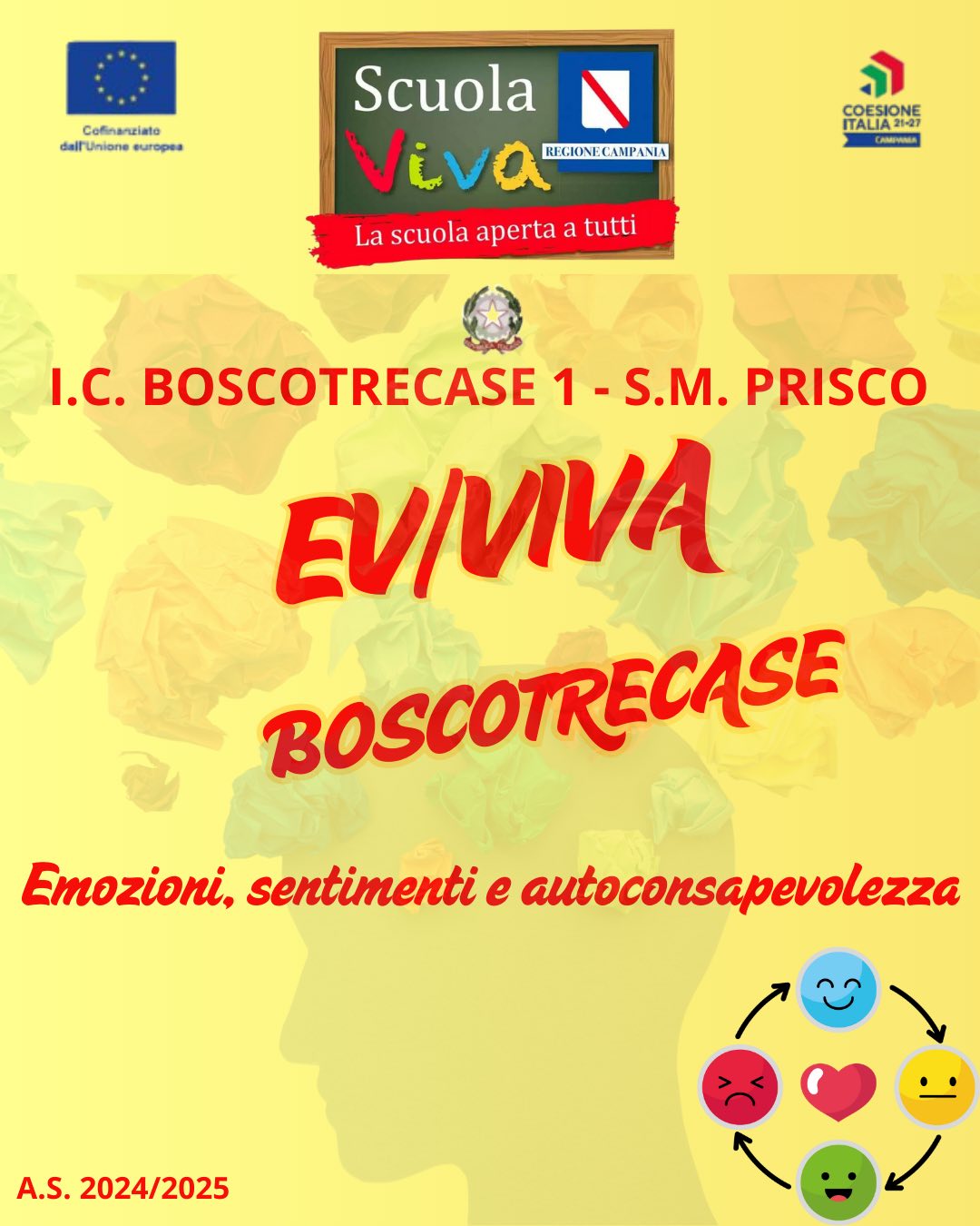 All’IC 1 Prisco di Boscotrecase, con entusiasmo e tante novità, prende il via il progetto EV/VIVA BOSCOTRECASE della II annualità del Programma Scuola Viva 2021-2027 della Regione Campania. Un progetto che trasforma la scuola in un laboratorio permanente di crescita, arte, emozioni e partecipazione attiva. Sei moduli coinvolgenti accompagneranno studenti e genitori in un viaggio educativo ricco di stimoli e significato.